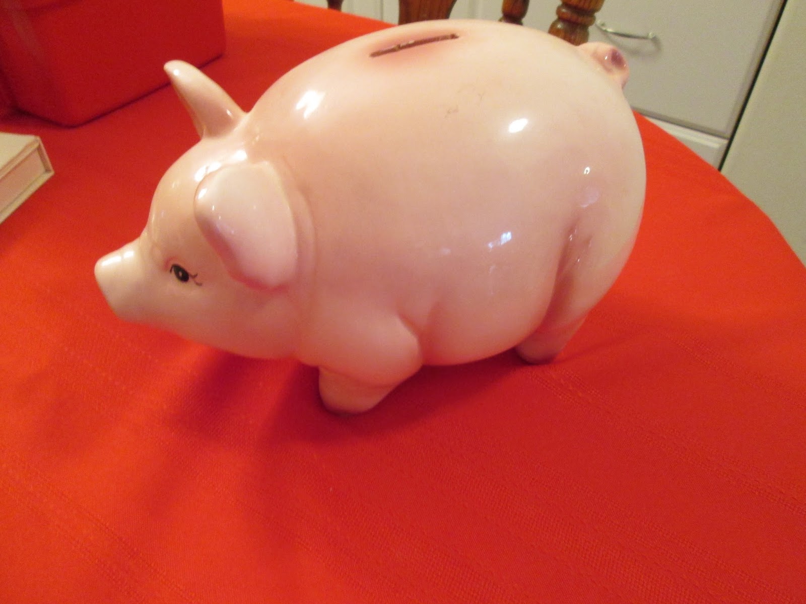 I'm the oldest of four girls. When I turned 60, the other three gave me a piggy bank containing sixty one dollar coins from each of them. (That $180 went toward my first trip to Camp Mini Ha Ha in Nova Scotia.) As each of them turned 60, the pig was passed on with the three un-birthday ladies each contributing $60. With my 70th looming (in a year and a half), Marie picked up a new pig for that decade. It will eventually be blinged out with Swarovsky crystals and signed by each of us in turn.