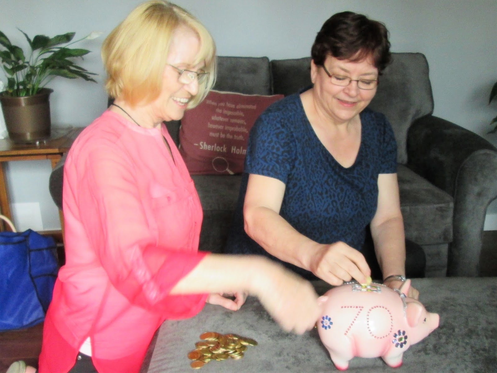 Saturday, (the third date we had chosen for the birthdays/housewarming at Leanne's), Leanne had to work! So Joanne and I went over a bit early to do some last minute things she hadn't had time to do. Shirley, Grahame, Marie and Rob arrived at 5 so Shirley and Marie fed the birthday pig before she arrived. Because there had been so many delays in the day, we could also celebrate Marie and Robert's May birthdays...so Shirley and Joanne were the only ones who had birthdays not being celebrated!