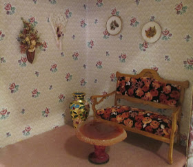 I remembered this great little settee that I picked up awhile back. It's a beautiful piece and perfect for this room as I don't have any matching pieces.