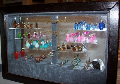 In June, 2009, I made this display for the perfume bottles I made back then. I was on a roll and needed a home for them. You can see more detail here.